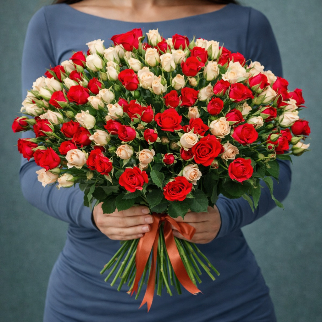 Букет «Сердце в кремовых лепестках» — это эффектное сочетание страсти и нежности в одной композиции. Яркие красные кустовые розы символизируют глубокие чувства и любовь, а утончённые кремовые оттенки добавляют букету мягкости и изысканности. Пышная форма и богатство бутонов создают впечатление роскоши и тепла, делая букет идеальным подарком для особенного человека.