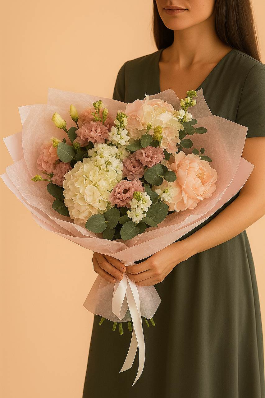 Композиция «Нежная гармония» — утончённый букет в мягких пастельных тонах, который подойдёт для любого повода. Лёгкое сочетание гортензии, пионов и эустомы создаёт атмосферу нежности и уюта.