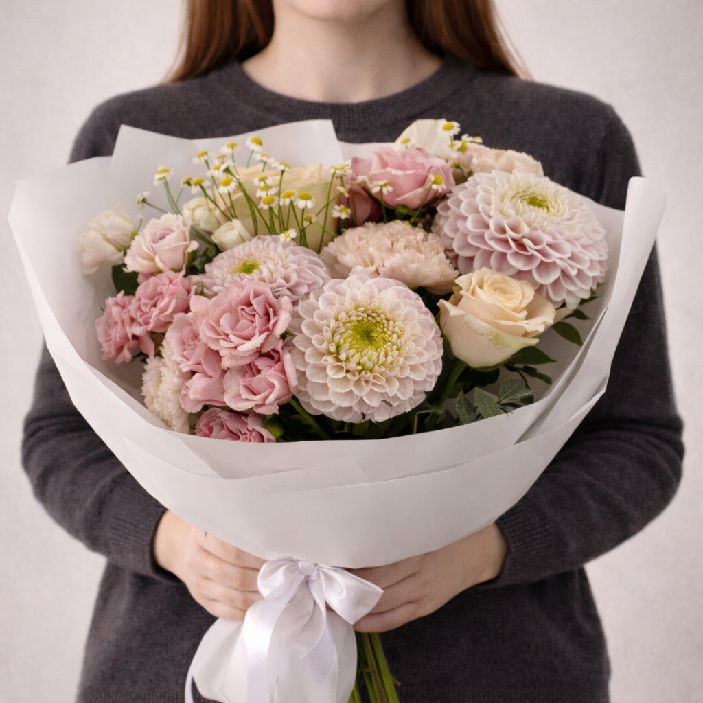 | Состав: | Гвоздики, Георгины, Кустовые розы, Розы, Ромашки |