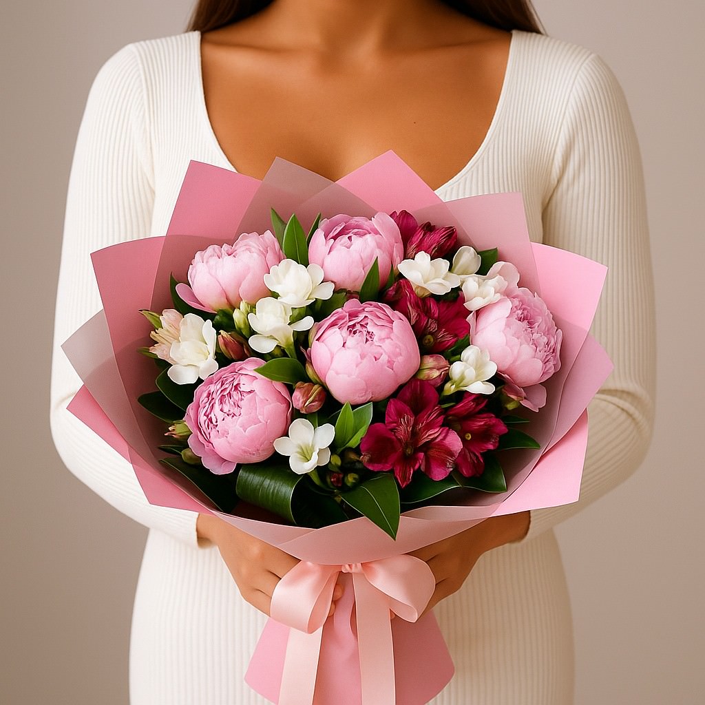 | Состав: | Альстромерии, Пионы, Фрезии |